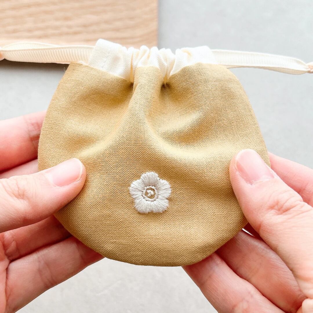 <プレゼント付>nico nico|手刺繍の小さなまんまる巾着|white