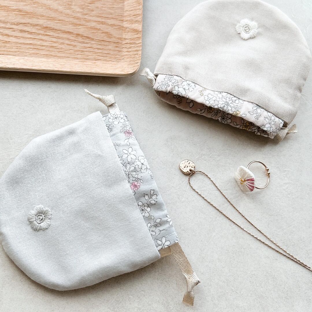 <プレゼント付>nico nico|手刺繍の小さなまんまる巾着|gray